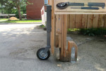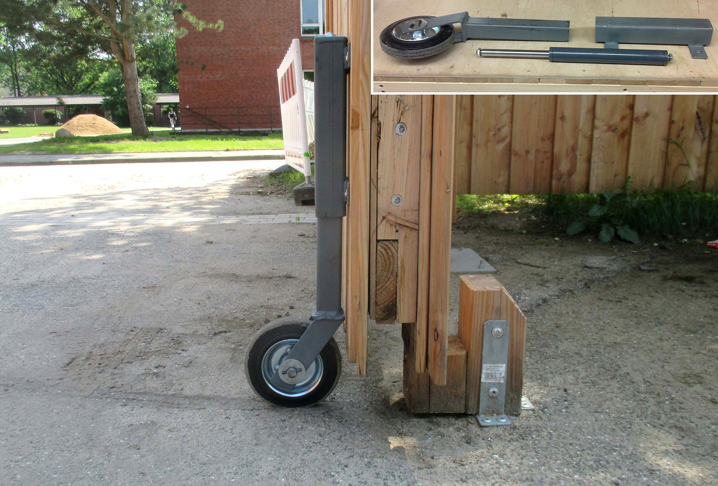 Um ein schweres Holztor vor einer Unterkunft für Asylbewerber auf unebenem Boden leicht verfahren zu können, kommen Gasfedern von ACE zum Einsatz. Dafür sind in diesem Beispiel die Gasdruckfedern GS-40 in die aus Metall gefertigten Stützen der Laufräder des Tores integriert. Als ausgleichendes Element sind die GS-40 Gasfedern für diese Aufgabe eigentlich deutlich überdimensioniert. Dank der Ventiltechnik von ACE ließ sich vor Ort so viel Stickstoff aus den Zylindern der Industriegasfedern ablassen, dass diese dann in der Laufrad-Konstruktion optimal auf das Gewicht des hochwertigen Holztores einzustellen waren und nun perfekt funktionieren.