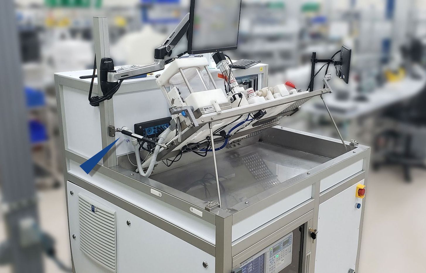 Um Tests von medizinisches Pumpen zu beschleunigen, musste Averna ein automatisiertes Kontrollsystem mit spezifischen und präzisen Eigenschaften entwickeln. Die Testeinheit benötigte eine Konstruktion, die es ermöglicht, sie für Sterilisation und Reinigung unter der Einheit anzuheben und zu reinigen. Um Schäden zu vermeiden, war eine gezielte Bewegungssteuerung beim Heben und Senken wichtig. Zusätzlich wurde großen Wert auf die Benutzerfreundlichkeit und Sicherheit für den Bediener gelegt. Averna nutzte das Gasfeder-Berechnungs-Tool von ACE und konnte damit die ideale Gasfeder für diese Anwendung bestimmen. Aufgrund der Umgebungsbedingungen und Platzbeschränkungen fiel die Wahl auf eine ACE Gaszugfeder.