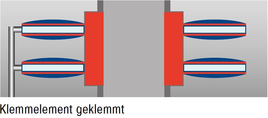 Alle Prozess- und Sicherheitsklemmen arbeiten mit dem bewehrten Federblechsystem.Zwischen zwei Federblechen, die umlaufend mit einer Gummierung verbunden sind, wird Druckluft eingebracht.Steht Druck an, ist das Klemmelement frei beweglich, wird das Klemmelement entlüftet, erfolgt eine Klemmung auf der Führungsschiene.