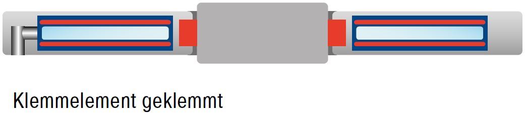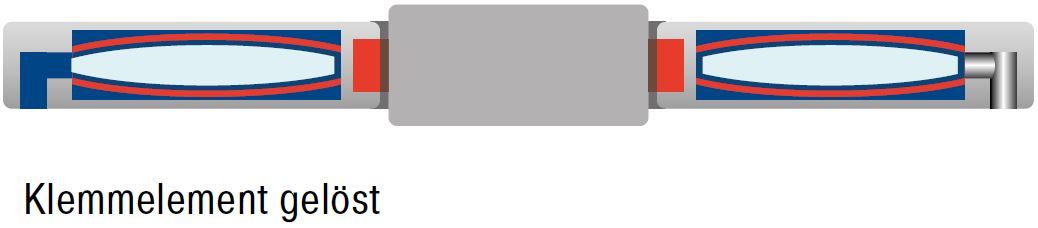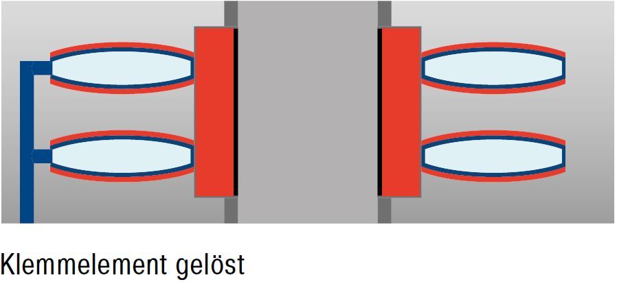 Geklemmt: Die Spannkraft des mechanisch vorgespannten Federblechsystems wird als Haltekraft in die Klemmbuchse eingeleitet. Die Stange bzw. Welle ist geklemmt.