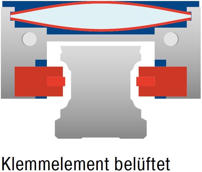Gelöst: Die druckluftbeaufschlagte Kammer zwischen den Federblechen ent spannt und löst die Klemm- bzw. Bremsbacken von der Schiene. Das Klemmelement ist frei beweglich.