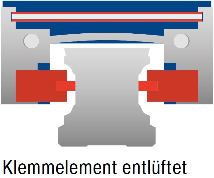 Gelöst: Die druckluftbeaufschlagte Membrane entspannt das Federblechsystem und löst die Klemmbuchse. Die Stange bzw. Welle ist frei beweglich.