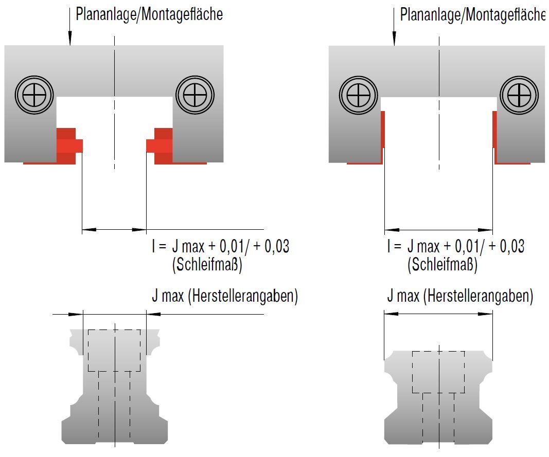 Das Innenmaß I zwischen den Belägen jeder LOCKED Schienenklemmung ist auf einen exakten Wert geschliffen. Dieser ist stets um 0,01 bis 0,03 mm größer als das sich aus den Herstellerangaben ergebende Größtmaß J max der jeweiligen Linearführungsschiene (siehe Zeichnung).
