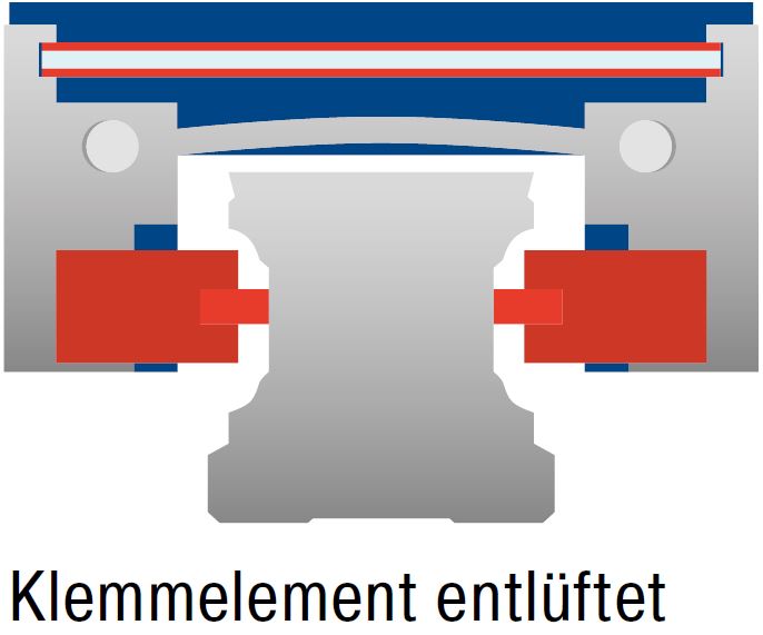 Geklemmt: Die Spannkraft der mechanisch vorgespannten Federbleche wird als Haltekraft in die Klemm- bzw. Bremsbacken eingeleitet. Das Klemmelement ist auf der Führungsschiene geklemmt.