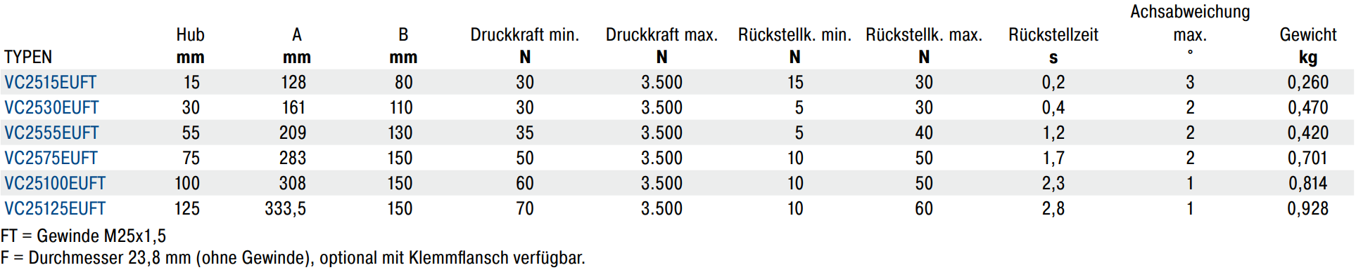 | VC 25125EUFT | Körper mit Gewinde M25 | ACE = 125 mm Hub, Deschner = 152 mm Hub | |