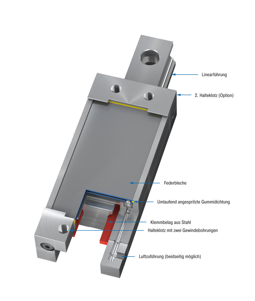 Überall auf Nummer sicher: Die Prozessklemmelemente LOCKED PL klemmen mit Kräften von bis zu 10.000 N direkt auf der Freifläche der Führungsschiene von Linearmodulen. Sie werden individuell auf die jeweils verwendete Linearführung angepasst und sind für alle Schienengrößen (20 mm bis 65 mm) und -profile aller namhaften Hersteller lieferbar.