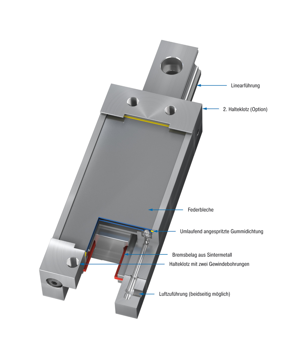 In den LOCKED SL Sicherheitsklemmelementen kommen spezielle Bremsbeläge aus verschleißarmem Sintermetall für die zusätzliche Not-Stopp-Bremsfunktion zum Einsatz. Die Produktfamilie SL überzeugt durch optimale statische Klemmung bei einer Lebensdauer von bis zu 1 Mio. Zyklen bzw. 500 Notfallbremsungen. Sie bietet zudem geringe Systemkosten verglichen mit hydraulischen und elektrischen Losungen.