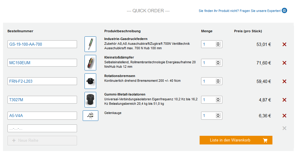 Auf dieser Seite haben Sie die Möglichkeit, eine Schnellbestellung durchzuführen. Hierzu tragen Sie bitte die entsprechende Artikelnummer in das Suchfeld ein. Zur besseren Führung erhalten Sie bei Gasfedern z.B. einen Hinweis zur Artikelnomenklatur. Erhöhen Sie bequem im Feld Stückzahl die gewünschte Liefermenge pro Artikel. Die Mengenrabattierung wird automatisch bei der Erhöhung der Bestellmenge mit berücksichtigt. Ordern Sie schnell und einfach Industrie-Stoßdämpfer, Gasdruckfedern und Schwingungsdämpfer online vom Hersteller.
