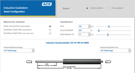 Mit dem Online Tool zur Gasfeder Berechnung ist unser erstes digitales Vertriebstool bereits seit Anfang 2018 online. Die Akzeptanz und das Feedback der Kundschaft fielen dabei sehr positiv aus. Die Angliederung des Gasfedershops, als logische Konsequenz eines komplett digitalen Vertriebsprozesses, verbessert das Angebot weiter. Durch unseren Gasdruckfedershop lässt sich jetzt also nicht nur die Gasfeder Auslegung bei ACE jederzeit selbst durchführen, sondern auch der Kauf. Dieser wichtige Schritt gewährleistet eine weitere Zeitersparnis im gesamten Bestellprozess und verknüpft das Gasfedertool mit dem Online Shop.