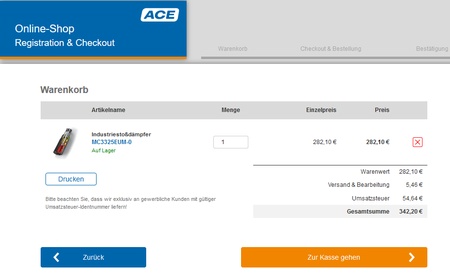 Bestandskunden wenden sich bitte per Mail an ebiz@ace-int.eu um Ihren individuellen Zugang mit den hinterlegten Konditionen zu erhalten.